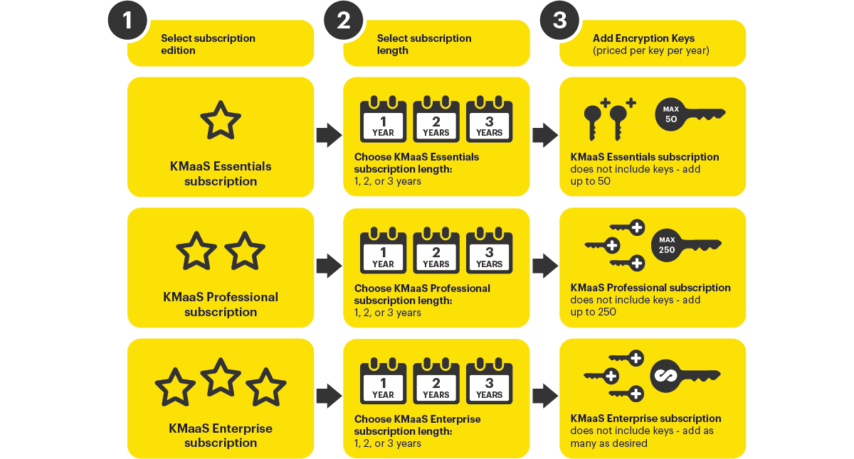 KMaaS Essentials Edition is designed for IT and Security Administrators at smaller companies who want to take advantage of built-in encryption for a limited number of use cases or who require only a limited number of keys. Keys are added as required for an additional charge. KMaaS Essentials is limited to 50 keys and a single encryption use case.