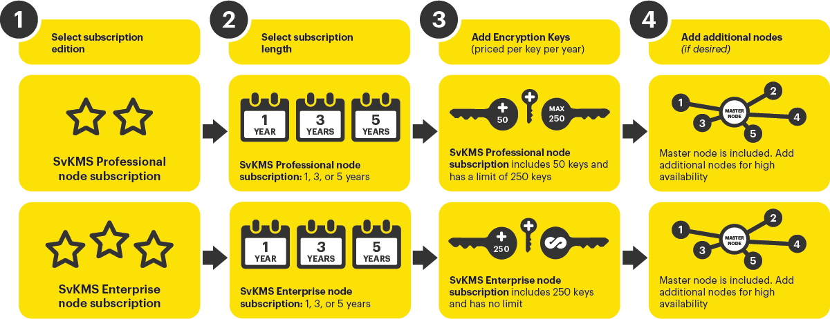 SvKMS Professional Edition is designed for IT and Security Administrators who need a key manager for a limited number of use cases, which might expand as time goes on. The SvKMS Professional node subscription includes 50 keys and has a limit of 250 keys.